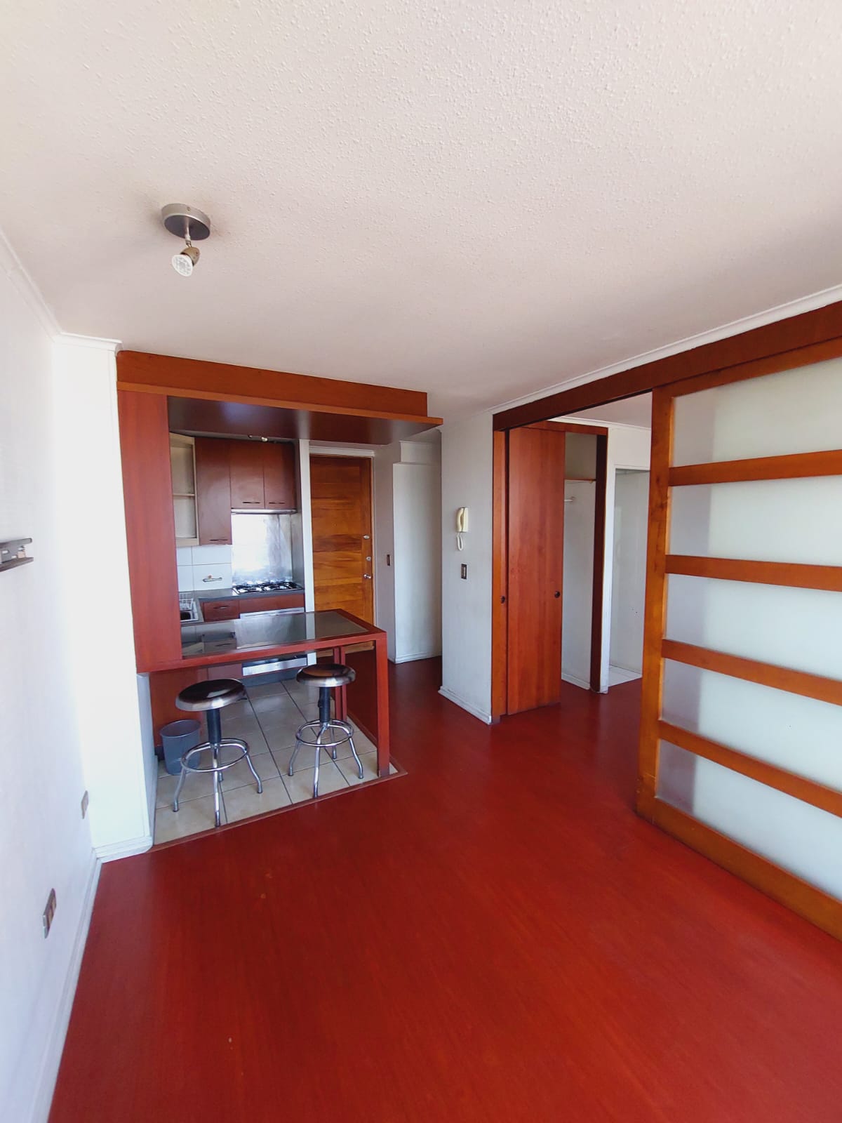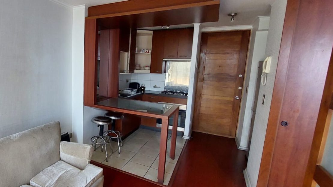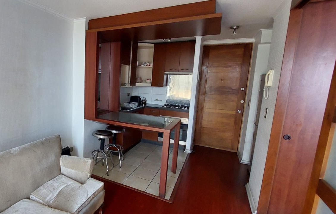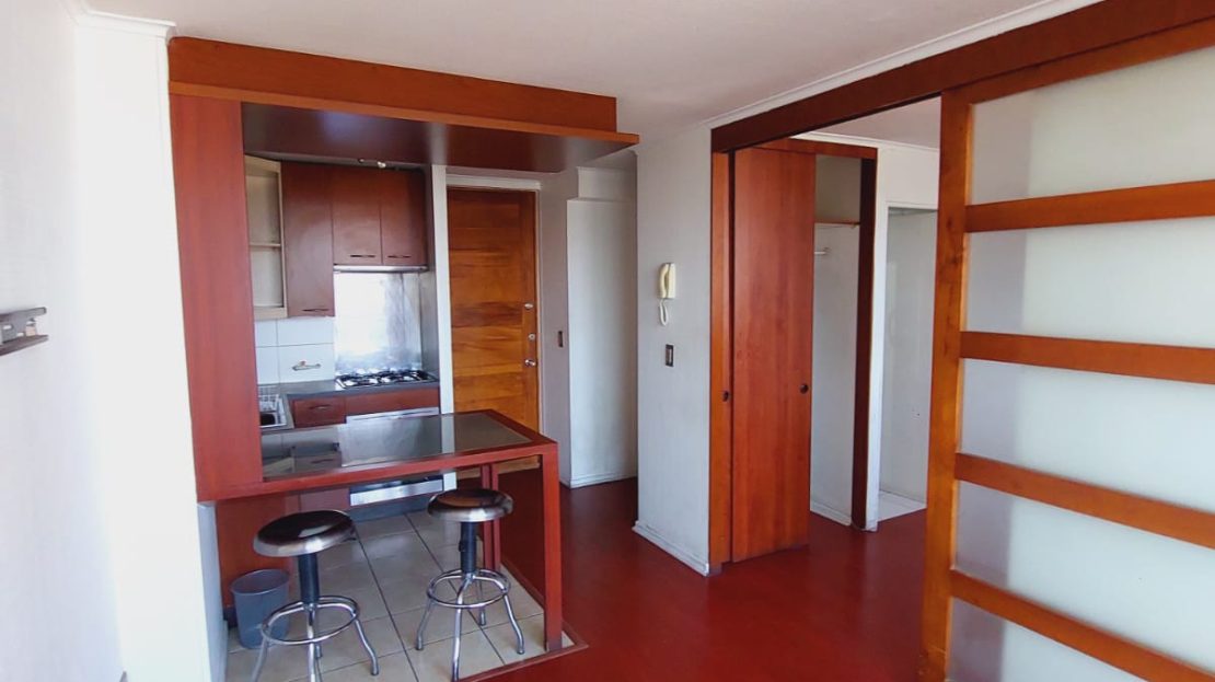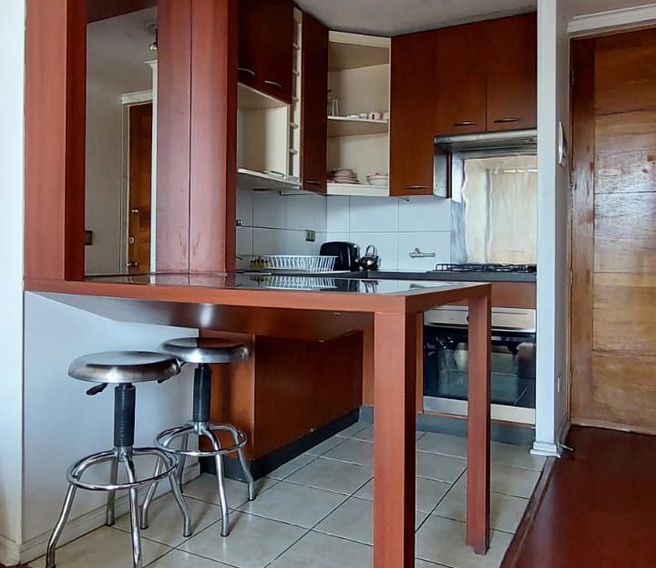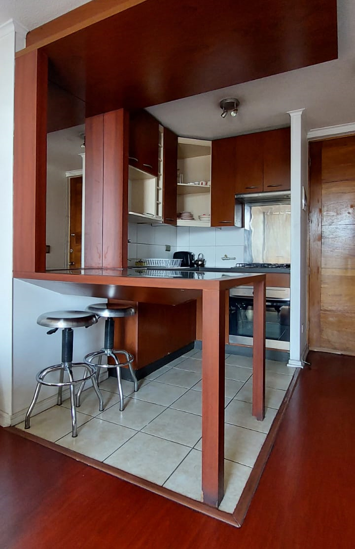 Departamento se distribuye de la siguiente forma: accediendo a tu derecha podrás encontrar la cocina completamente equipada con horno, encimera a gas, campana, lavaplatos y distintos tipos de muebles para organizar los utensilios, a la izquierda, un espacio amplio para poder ubicar el refrigerador.